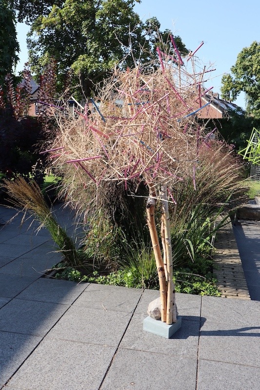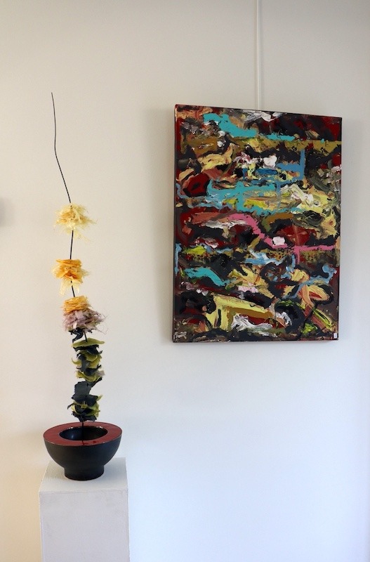Op de locatie Studio YOTEi was naast het gebruikelijke grote en kleine ikebana werken zowel buiten als binnen, schilderijen en objecten van keramiek te zien van Martin de Jong.