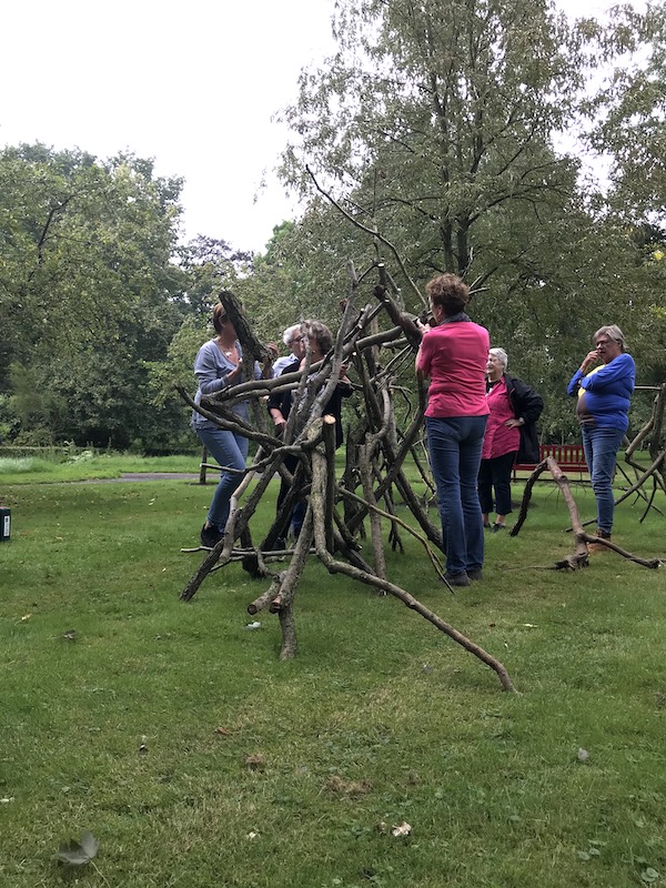 In the Arboretum in Oudenbosch, where it was easy to work in the open air, we were hospitably welcomed. We were able to work individually to combine the pieces we had made into one large work in the course of the afternoon. There was a remarkable contrast in the materials to be used: branches of Salix fragilis (crack willow) for a stand-alone construction, and pulp cane to add a color accent.