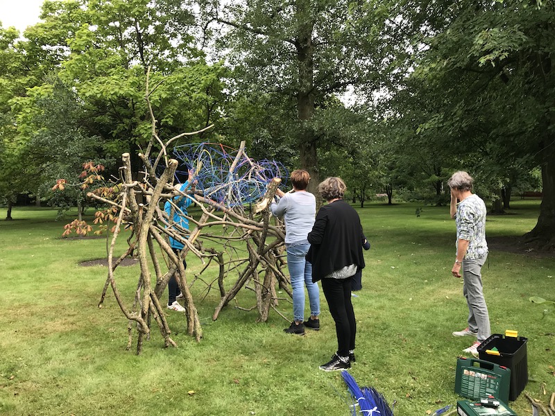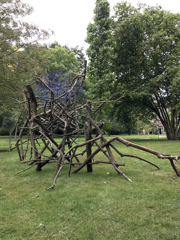 After much weighing and weighing, placing and moving, moving closer together and placing more spaciously, a sturdy work stood, nicely in the garden space. The beautiful wicker structures eventually became a mass among the branches, adding colour to the whole.